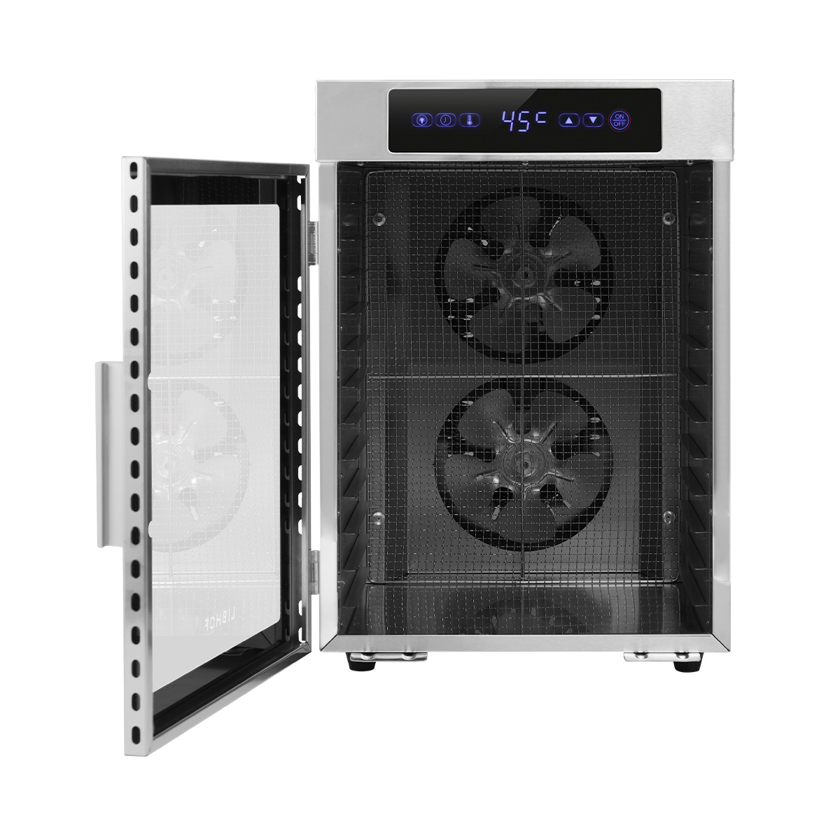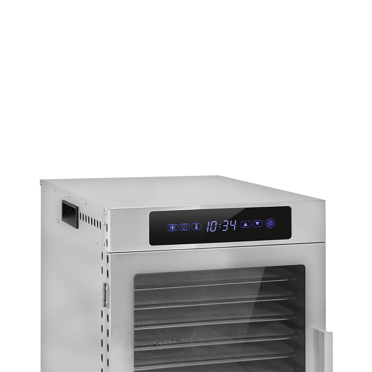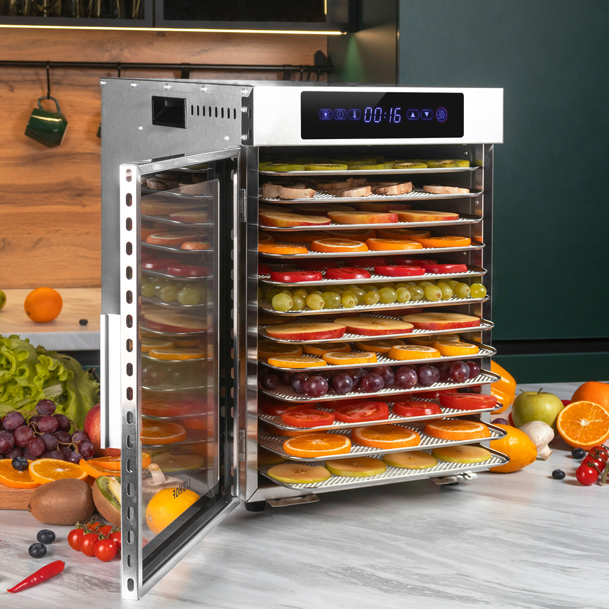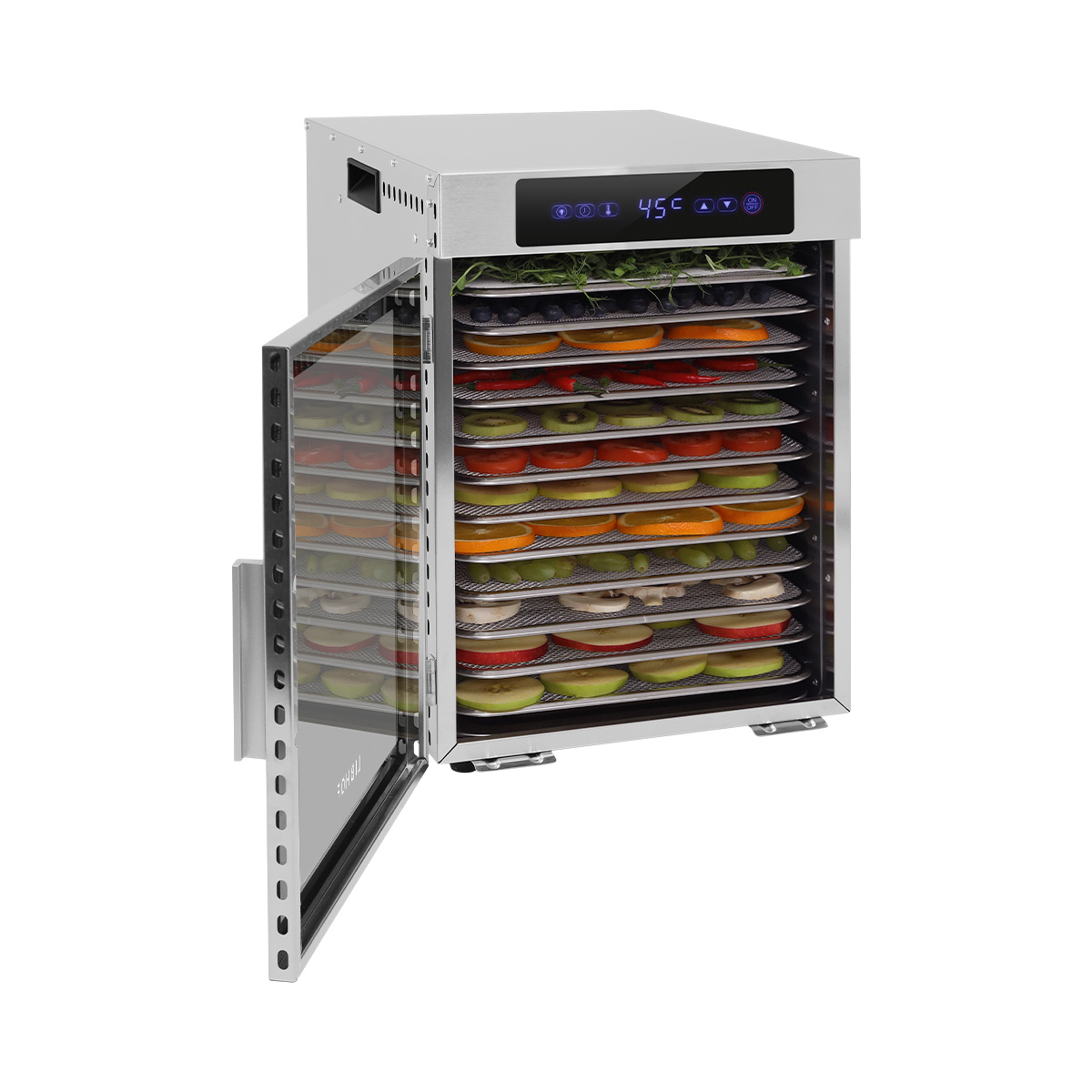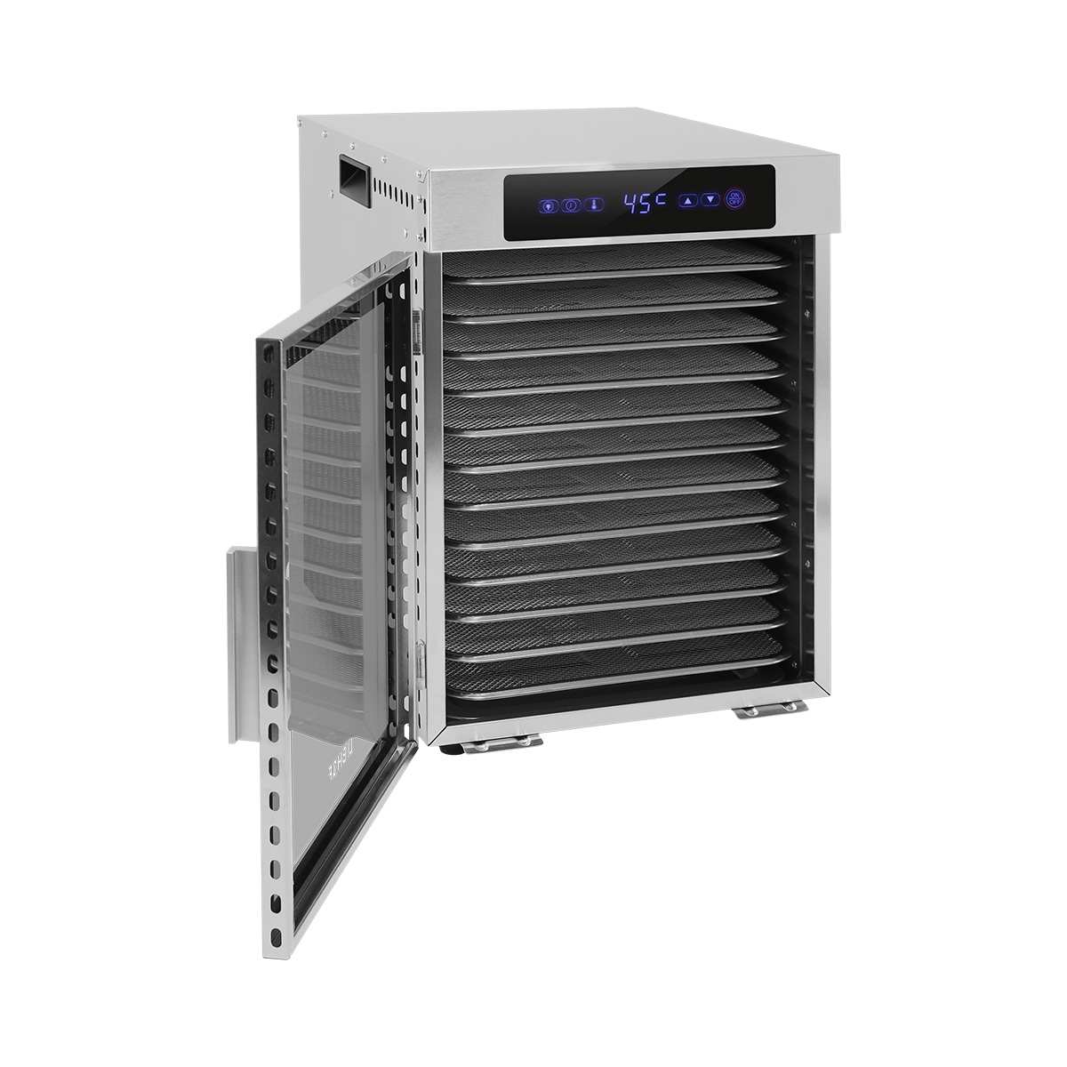 dehydrator, 12 stainless steel trays, 1 drip tray, 6 mesh sheet, 6 jelly roll trays, user manual, recipe book |