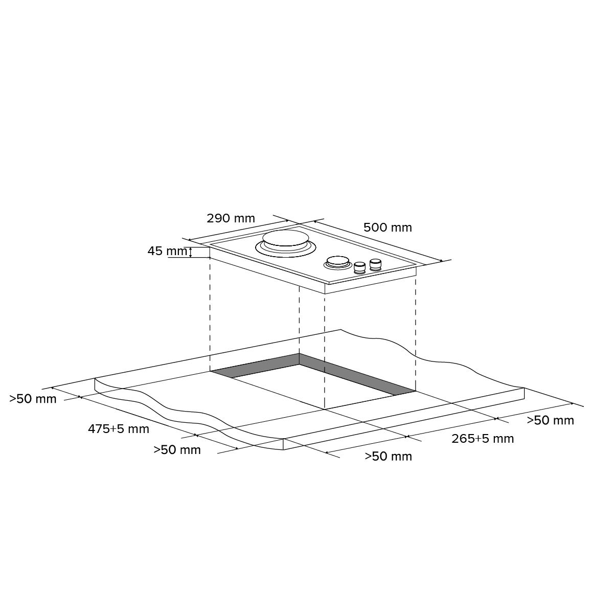 The gas hob is equipped with a gas control function that automatically turns off the gas supply if the flame goes out. An automatic electric ignition is provided for the convenience of igniting the burners.