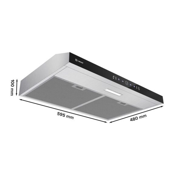 The exhaust capacity of this suspended kitchen hood is 390 cubic meters/hour, which makes it possible to effectively purify the air in rooms with an area of up to 14 square meters. The 60 cm wide kitchen hood is easy to install, fits perfectly with standard cabinets, and its silver body will become a stylish accent in the kitchen interior.