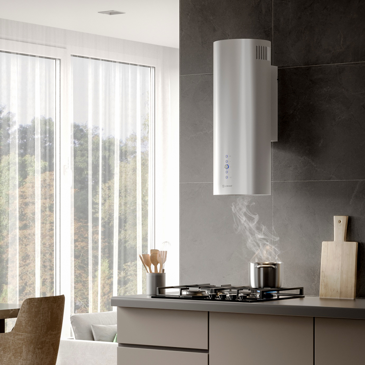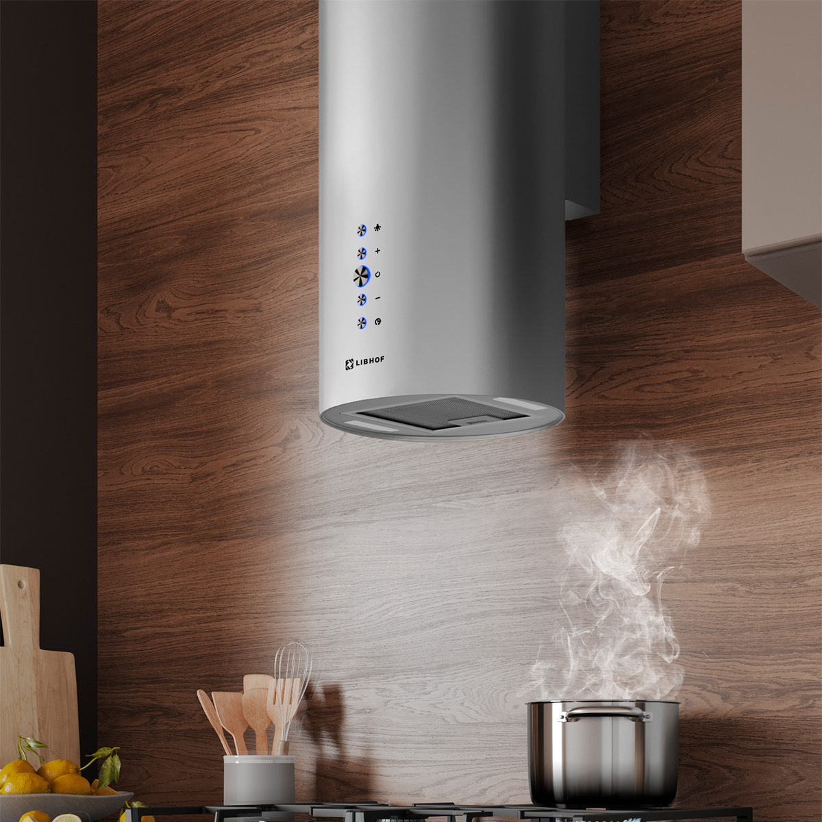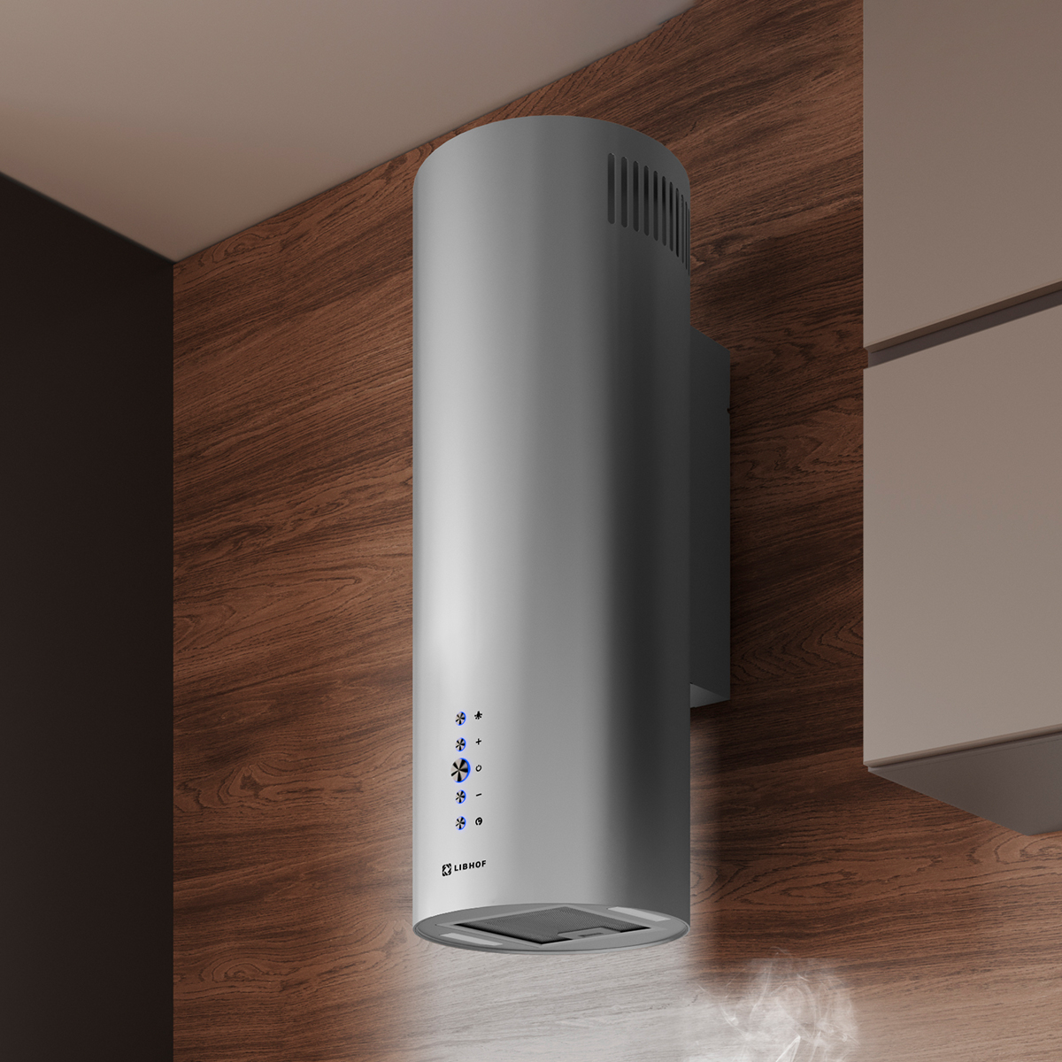 The cylindrical wall-mounted hood is equipped with a five-layer grease filter, which provides reliable protection against dirt. The filter effectively captures grease and soot. Additionally, the anti-return valve prevents the return of unpleasant air.