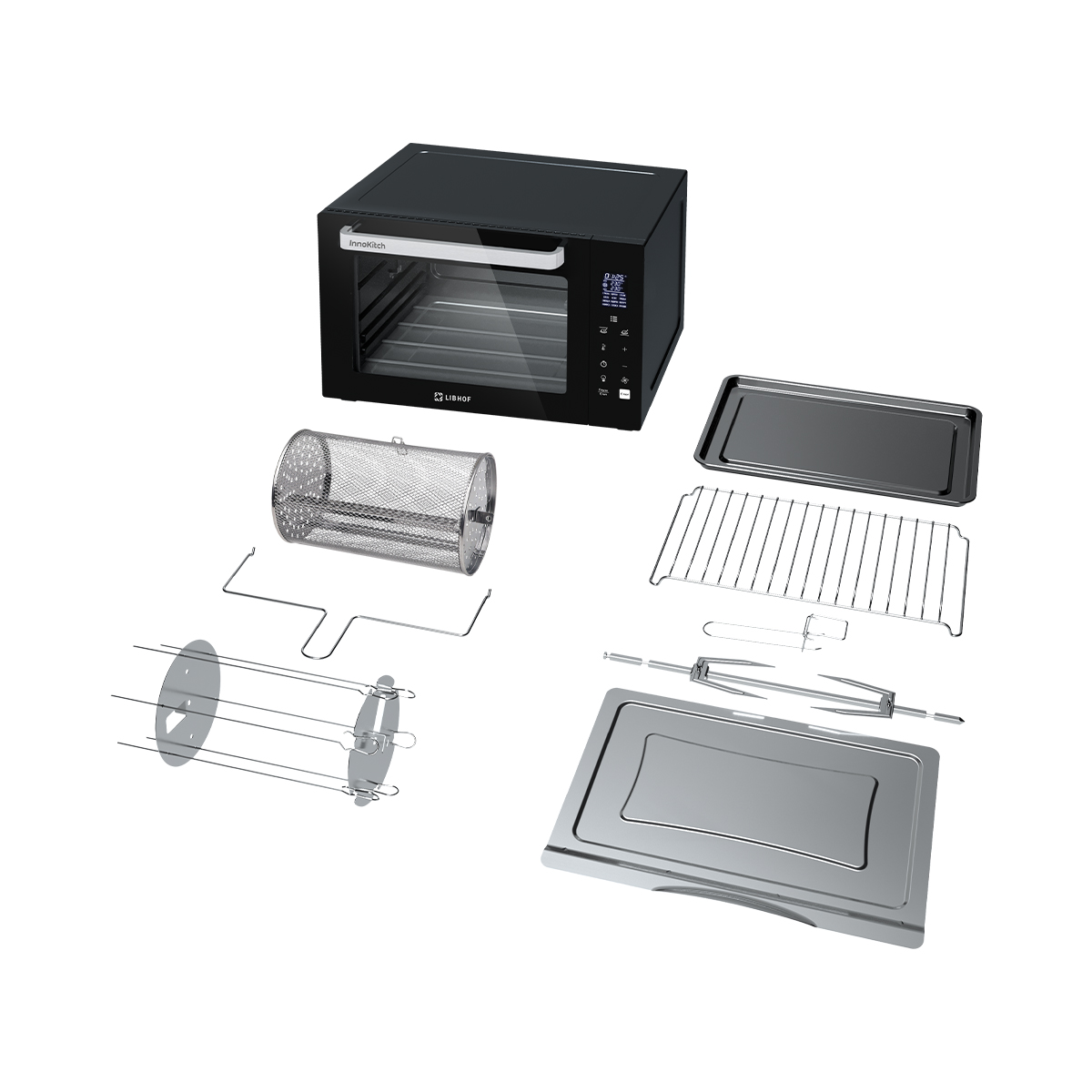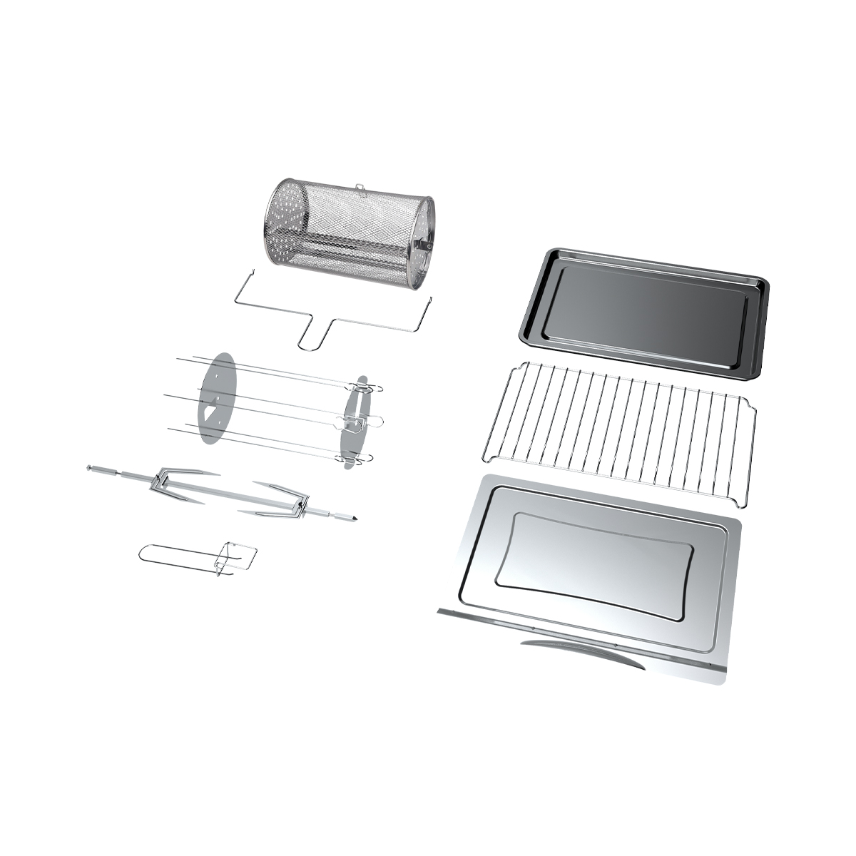 mini oven, grill set, baking tray, grate, tray handle, crumb tray, rotating basket user manual, recipe book, barbecue fork |