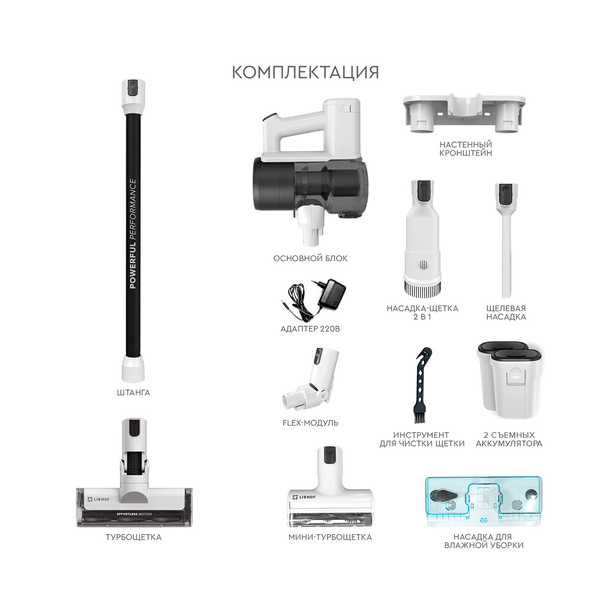 Main unit, dust collector, wall bracket, charger, rod, flex module, turbo brush, crevice tool, 2-in-1 brush nozzle, mini turbo brush, wet cleaning nozzle, brush cleaning tool, removable battery – 2 pcs. |
